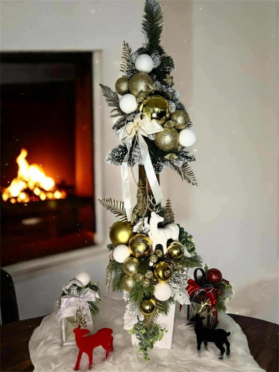 Przepiękną choinkę na naturalnym pniu, umieszczoną w stylowej doniczce i ozdobioną eleganckimi dekoracjami. Idealna, aby wprowadzić do wnętrza ciepły, świąteczny klimat.