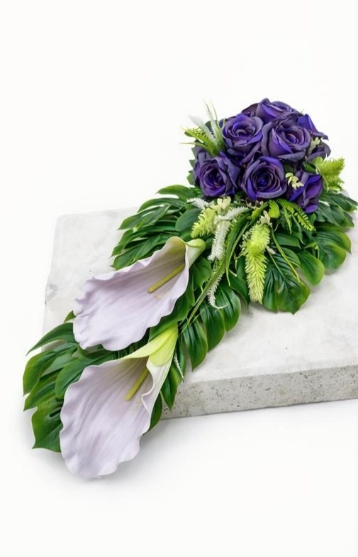 Elegancki stroik nagrobny wykonany z wysokiej jakości sztucznych kwiatów to wyjątkowa i trwała forma upamiętnienia bliskich. Kompozycja utrzymana jest w stonowanej, ale bardzo szlachetnej kolorystyce – fioletowe róże połączone z delikatnymi kaliami oraz bogatą zielenią tworzą harmonijną i ponadczasową całość.