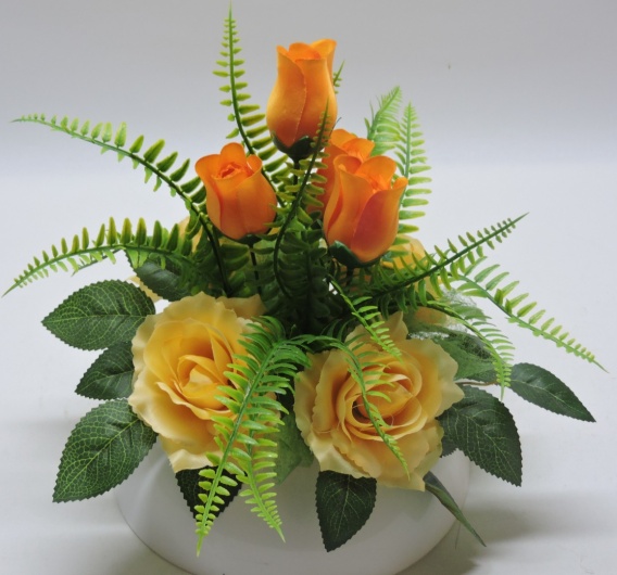 Kompozycja kwiatowa umieszczona jest w owalnej, białej doniczce z obciążeniem betonowym ( zapobiega zdmuchnięciu i przemieszczaniu się stroika) . Składa się z sztucznych kwiatów, głównie róż w dwóch odcieniach, smukłych pąków różanych wystających ku górze oraz jaśniejszych, rozwiniętych róż. Kwiaty otoczone są licznymi zielonymi paprociami i liśćmi, które dodają objętości i naturalności całej aranżacji.