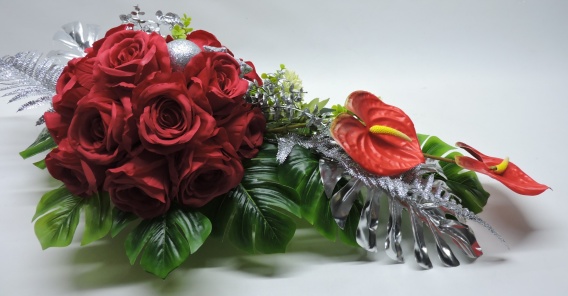 Elegancka, utrzymana w bożonarodzeniowym klimacie dekoracja, która łączy głęboką czerwień róż z połyskiem srebrnych dodatków. Kompozycję dopełniają anthurium, zielone akcenty oraz błyszczące świąteczne ozdoby, tworząc wyjątkowy, pełen ciepła i pamięci aranż.